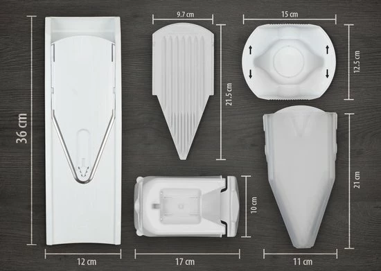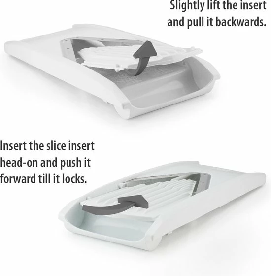 Je kunt alles fijn snijden. Denk aan tomaten, komkommers, uien, appels of aardappels. Laat de messen in de kast liggen en maak gebruik van deze snijder. Je kunt fruit en groente met verschillende afstanden snijden: 1,2 mm, 2,8 mm, 5,0 mm en 7 mm. Zo kun jij genieten van heerlijk dunne plakjes komkommer voor je salade of dikke stukken tomaat voor op je broodje gezond.