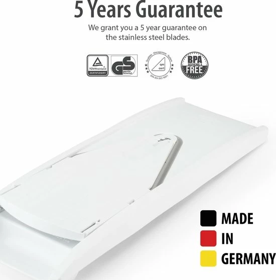 De messen zijn roestvrij en het gehele product is BPA-vrij. BPA zit vaak in plastic en kan schadelijk zijn, maar de mandoline is volledig vrij van BPA. Dit product is dan ook streng getest op kwaliteitsborging. Goed om te weten voor het bereiden van gezond voedsel voor jezelf en voor je kind.