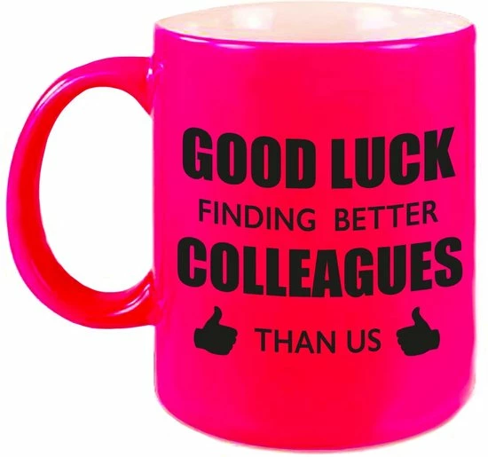 Bellatio Decorations Good Luck Finding Better Colleagues Than Us Koffiemok / Theebeker – 300 Ml – Neon Roze – Carriere Switch / VUT / Pensioen – Bedankt Cadeau Collega