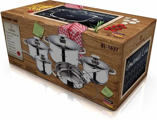 | Verpakkingsinhoud | RVS, Pannen, Set, bestaat, uit:, <br, />kookpannen, Ø18, Ø20, Ø24, <br, />Hapjes, pan, Ø24x7cm, 2, 9liter, <br, />Steelpan, Ø16, cm, 1, 9, liter. |