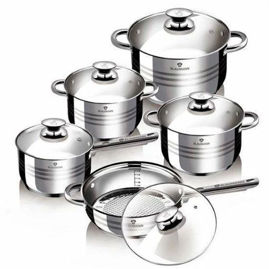 Blaumann BL-1637. Materiaal: Roestvrijstaal, Inwendige coating: Roestvrijstaal, Kleur handvat: Roestvrijstaal. Diameter steelpan: 16 cm, Diameter steelpan 2: 18 cm, Diameter steelpan 3: 20 cm. Aantal steelpannen: 5 stuk(s), Aantal koekenpannen: stuk(s)