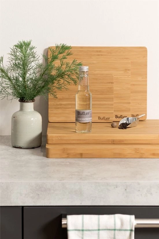 Deze bamboe snijplank van Butler is geschikt voor het dagelijkse snijwerk in de keuken. Ook is de snijplank perfect voor het mooi presenteren van bijvoorbeeld stokbrood en hapjes. De snijplank is gemaakt van de beste kwaliteit bamboe, een mooi en natuurlijk materiaal dat dankzij de harde en dichte structuur nauwelijks vocht opneemt. De natuurlijke uitstraling maakt dat deze snijplank zowel in de moderne als klassieke keuken past. Het label van de snijplank geeft duidelijke tips voor onderhoud en gebruik.
