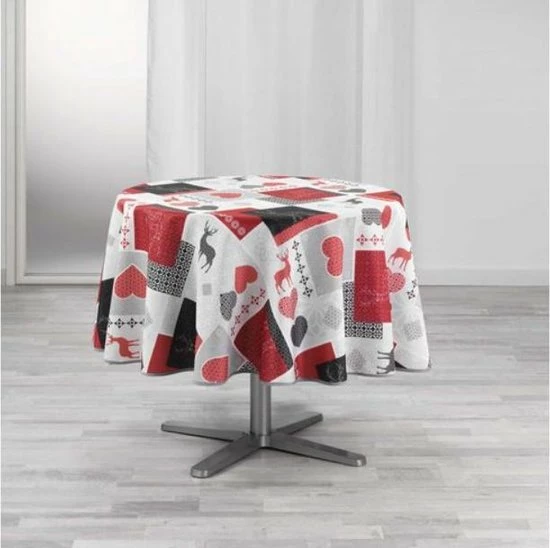 Mooi tafelkleed met motief van hartjes en rendieren. Het polyester materiaal is anti-vlek en anti-kreuk. De kleur is rood en wit met grijze en zwarte accenten. Voor 8 tot 10 couverts.