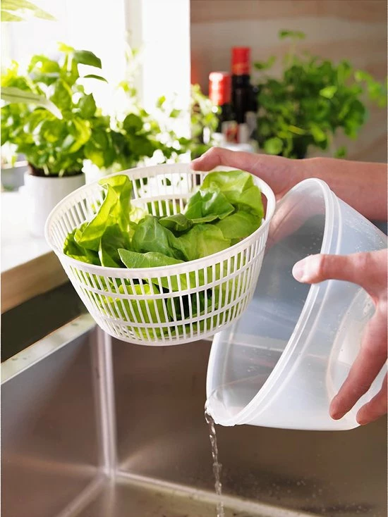 Voor iedereen die van lekker groen en lekker gezond houdt: met deze slacentrifuge brengt u blijdschap in de keuken en tovert u in een handomdraai verschillende verse salades op tafel. Vergrendel de deksel, draai de hendel rechts- of linksom en giet het overtollige water eruit via de praktische uitsparing op het deksel. De centrifuge beschikt over rubberen voeten, zodat deze stevig staat bij het bereiden. Krop- of ijsbergsla – het maakt deze slacentrifuge niet uit: In een handomdraai levert de slacentrifuge knapperige en droge sla. De centrifuge bestaat uit 3 delen: schaaf, zeef en deksel. De deksel is voorzien van gaatjes waardoor je het water eenvoudig uit de slacentrifuge kan laten lopen. Dankzij de rubberen voet en rubberen hendel is het makkelijk de centrifuge te gebruiken op het aanrecht. Giet het overtollige water eruit, leg uw verse sla in een saladeschaal en maak hem op smaak naar keuze!