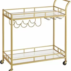 FURNIBELLA – Serveerwagen, Trolley Met Wielen, Glashouder, 2 Glazen Leggers, Bar Trolley, Wijn Trolley, Voor Keuken, Eetkamer, Bar, Goudkleurig LRC090A03