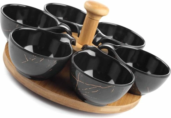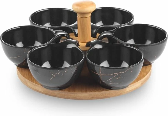 Draai plateau incl.6 melamine schaaltjes op een houten draai plateau. Presenteer uw hapjes nog mooier met deze melamine serveer plateau. Perfect om te gebruiken voor hapjes, tapas of voor bij het gourmetten of fonduen.