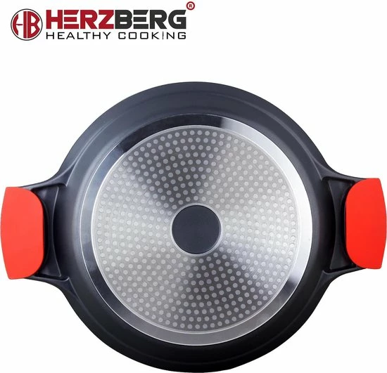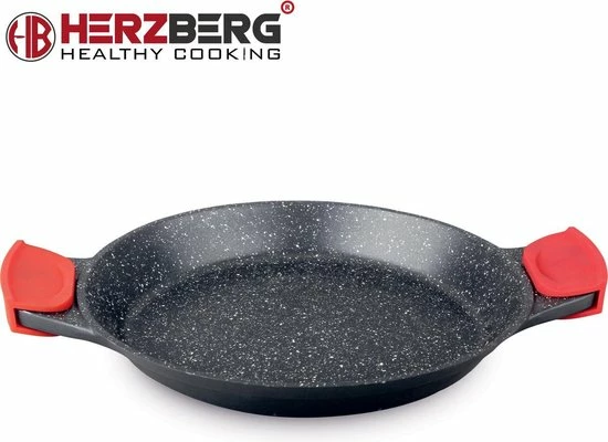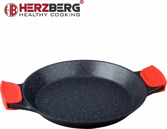 De Herzberg HG-7132PP is een paellapan van 32 cm die plaats biedt aan maximaal 8 personen. Deze paellapan is gemaakt van duurzaam gegoten aluminium en heeft een marmercoating die ongekende antikleefprestaties levert zonder het risico van blootstelling aan deze controversiële chemicaliën. Deze marmeren coating is PFOA-vrij en hard genoeg om krassen te weerstaan. De handgreep is volledig geïntegreerd en werd geleverd met een zachte, hittebestendige en afneembare siliconen handgreep. De aluminium behuizing heeft een gemagnetiseerde basis voor gebruik met inductiekachels voor snelle warmteoverdracht. De volledige constructie van deze paellapan is opmerkelijk omdat hij snel opwarmt en een perfecte warmteverdeling heeft en geen hete plek en ongelijke verbranding, alleen perfect gekookte paella. Deze basis op de samengestelde bodem kan ook worden gebruikt op verschillende warmtebronnen, waaronder gas, elektrisch, keramisch, oven, kampvuur, grill, oven en zelfs in inductiekookplaat. Het is gemakkelijk schoon te maken vanwege zijn anti-aanbak mogelijkheid en zelfs vaatwasserbestendig. Braad, bak, bak, gril, stoof, bak of grill met deze veelzijdige kookpan en geniet van de geweldige toevoeging aan uw kookgerei.