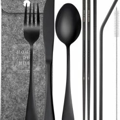 Inhoud: 1x Lepel, 1x Vork, 1 Mes, 1 paar Eetstokjes, 2x Herbruikbare Rietjes, 1x Reinigingsborstel Rietjes, 1x Opberghoes