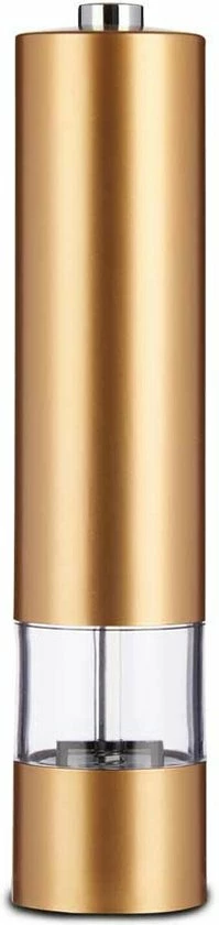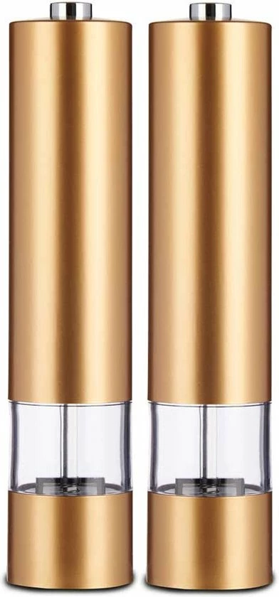 Kinvara Elektrische zout/pepermolen 2 stuks LED kunststof goud 23 cm. Elektrische zout/pepermolen, geschikt voor het malen van diverse kruiden/specerijen, peper en zout. Niet geschikt voor in de vaatwasser. Afmeting: 6 x 6 x 23,5 cm. Kleur: goud. materiaal: kunststof.