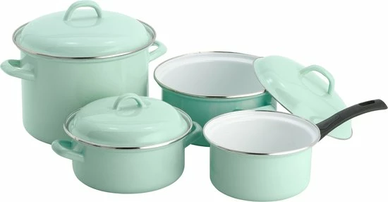 Smakelijk en energiebesparend koken maar ook heel gezond! Professionele en zware kwaliteit emaille 4-delige pannenset. De pannen zijn zeer trendy en modern tegelijk met de trendy olijf groene kleur die ze hebben. Ze zijn geschikt voor alle warmtebronnen, zelfs voor inductie. De pannen zijn energiebesparend doordat ze de warmte goed vasthouden. Klein pluspuntje: de pannen zijn uitstekend geschikt voor mensen met een nikkelallergie. Ook zijn de pannen ovenvast en vaatwasmachine bestendig.