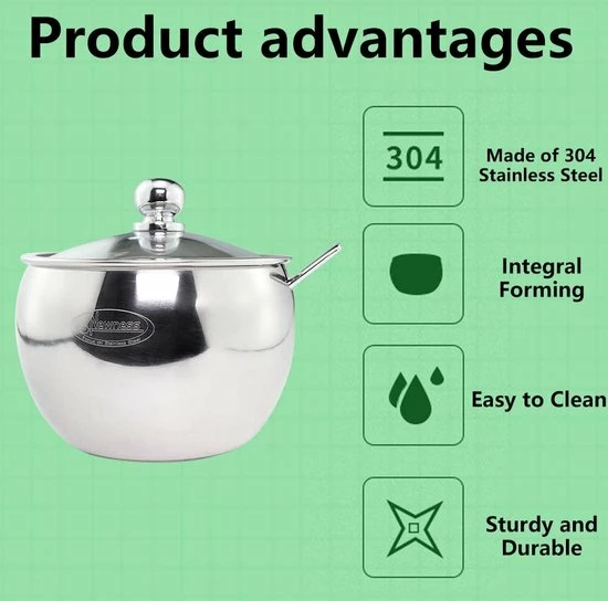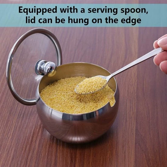 | Verpakkingsinhoud | roestvrijstalen, suikerpot, met, transparant, deksel, +, lepel |