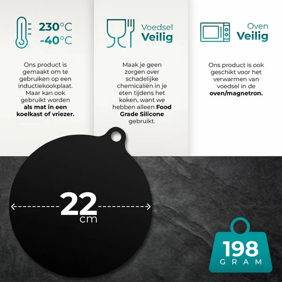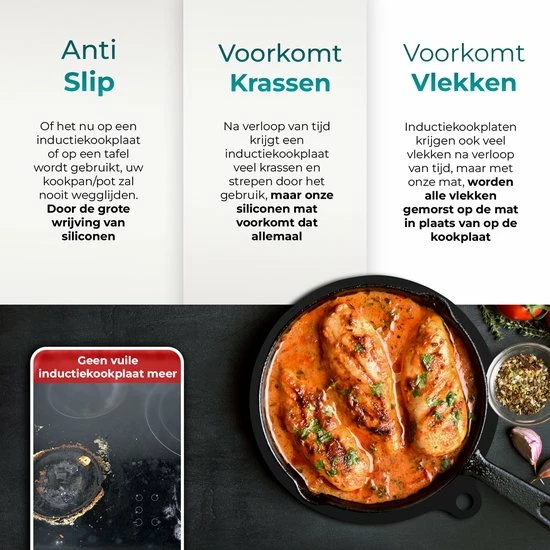 De inductie beschermer is gemaakt van siliconen en is BPA vrij. De inductiebeschermer bevat een speciale antislip coating. Dit zorgt ervoor dat de pannen niet schuiven, waardoor krasvorming wordt voorkomen op de inductiekookplaat.