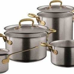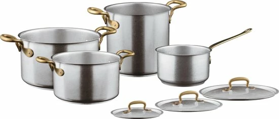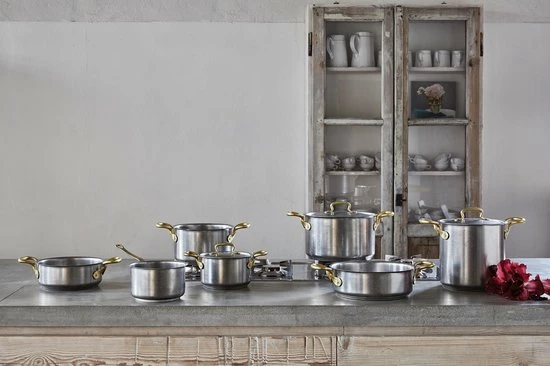 Het Vintage pannenset heeft een design uit het verleden met de techniek uit het heden. De pannen zijn gemaakt van 18 / 10 RVS en hebben handvaten van messing. na gebruik kunnen de pannen in de vaatwasmachine.