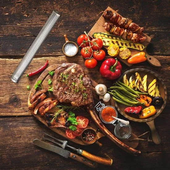 Wanneer het al water al in de mond loopt, wanneer je aan de lekkere smaak denkt, zul je heel veel plezier hebben met de rookstaaf van roestvrij staal. Hij is heel eenvoudig te gebruiken: Leg de smoker tube horizontaal op de barbecue. Dan vul deze met rookchips op pellets en steek het vervolgens aan. De vele gaatjes zorgen ervoor, dat het rook gelijkmatig in de grill verdeeld wordt – dat is een duidelijk voordeel ten opzichte van smokerboxen. Om het grillaccessoire eenvoudig mee te nemen, hoort een handige draagtas bij de leveromvang. Rookstaaf RVS in detail – Afmeting H x D: ca.30 x 3,8 cm – Afmeting opening: ca. 1.6 en 2,2 cm – Materiaal: Roestvrij staal – Gewicht: ca. 85 g Smoker tube voor heerlijke smaak – Grillvlees met lekkere rooksmaak genieten – Geschikt voor gas-, kogel- of houtskoolbarbecue – Gelijkmatige verdeling van rook – Met opbergtasje Leveromvang – 1 x rookstaaf – 1 x tasje – Decoratie is bij de levering niet inbegrepen