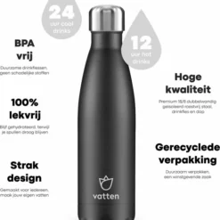 Vatten® Premium RVS Thermosfles – 500 Ml – Mat Zwart – Waterfles Met Rietje – Isoleerfles