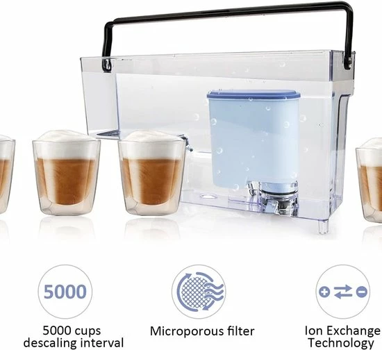 - De ionenwisseltechnologie kan kalk uit het water verwijderen voordat het in je koffiezetapparaat stroomt, en voorkomt zo de vorming van de ketelsteen