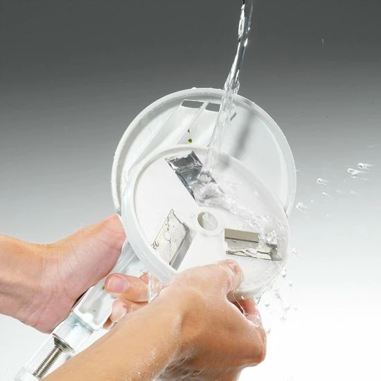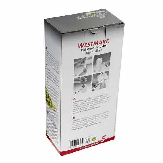 Een unieke hulp bij het snijden van bonen voor bijvoorbeeld een soep, een salade of als groentegerecht naast de bekende Hollandse aardappel. Deze handmatige bonensnijder van Westmark is zeer praktisch in gebruik. Het enige wat je hoeft te doen is je snijboon, sperzieboon of kousenband in de snijder te stoppen en vervolgens te gaan draaien aan het hendel. De bonen worden door de drie geharde en geslepen messen in mooie gelijkmatige stukken gesneden en zijn direct klaar voor bereiding. De stevige tafelschroefklem zorgt ervoor dat je stabiel kunt werken. Na gebruik is deze bonensnijder gemakkelijk schoon te maken met warm water en een sopje. De snijder is gemaakt van aluminium en heeft ultra scherpe RVS messen. De afmeting van deze bonensnijder is 12,3 x 14 x 26,5 cm.